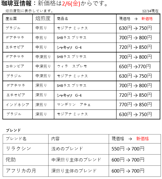 〇値上げの時期については、1月からとしていましたが、2/6(金)からの値上げに変更します。変更価格の詳細を載せました。下記参照。